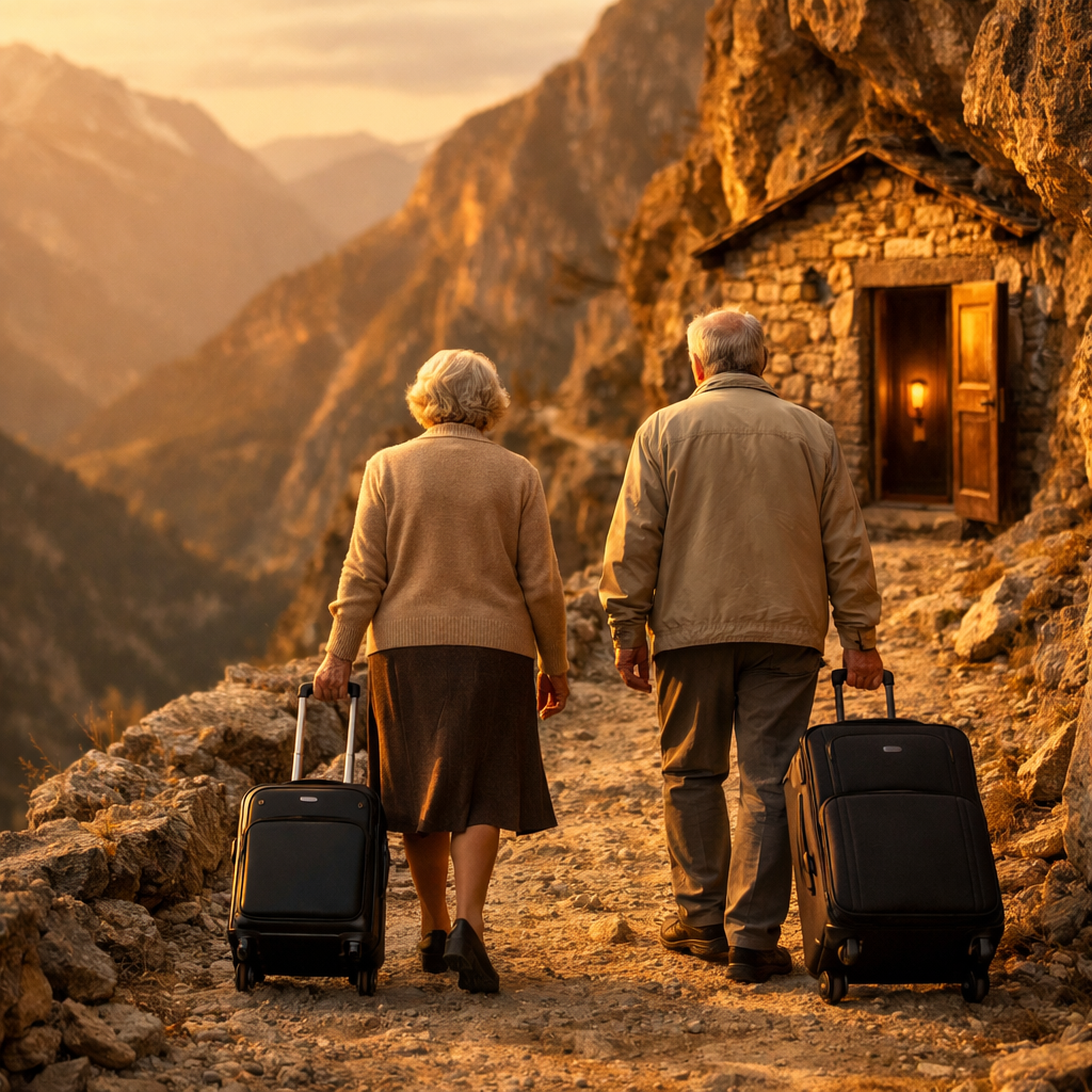 Андрій постукав. Відлуння пішло вглиб, глухе й об’ємне, ніби за дверима справді був простір — кімнати, стіни, повітря. Ніхто не відповів. Він обережно потягнув ручку — замкнено. Роза стисла його лікоть: «Не треба… це чуже». Та Андрій уже помітив камінь, який лежав так рівно, ніби його поклали навмисне. Він підняв його — і там, у вогкій ямці, лежав іржавий ключ. Роза видихнула: «Ми нарвемося на біду». Андрій подивився на небо, що швидко темніло, на її змерзлі пальці, на чемодани. «Яка біда гірша за ніч просто неба? Лише одна ніч. Завтра знайдемо господарів і все пояснимо». У його голосі не було зухвальства — тільки втома людини, якій уже нічого втрачати, крім тепла в грудях.Ключ провернувся з хрипким скреготом. Двері скрипнули так, ніби зітхнули. Усередині тягнуло прохолодою і чимось солодким — як сушені яблука й старе дерево. Андрій запалив запальничку, полум’я тремтіло, але вистачило, щоб побачити: підлога — дерев’яна, рівна; стіни — кам’яні, акуратно обтесані; далі — стіл, лавки, полички з банками варення й маринованих грибів. Це не була печера. Це був дім, вирубаний у горі, доглянутий так, ніби господарі вийшли на хвилину й от-от повернуться. І найстрашніше — стіл був накритий на двох: дві тарілки, дві чашки, дві ложки, складені серветки. Роза відчула, як по спині пробіг холод: «Нас чекали?»