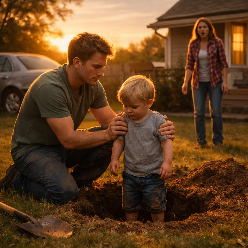 Сначала в ответ была тишина. Потом я услышал слабый плач. Не обычный детский плач, а тихое, вымотанное всхлипывание, когда у ребёнка уже почти не осталось сил. Я включил фонарик на телефоне и повёл лучом по двору. Земля после недавних дождей была тёмной и тяжёлой. И вдруг свет упёрся в край глубокой ямы.