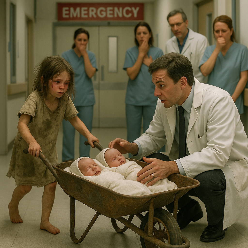 Утром автоматические двери резко разъехались в стороны, и дежурная медсестра застыла, не веря своим глазам. В приёмный покатился скрипящий, перекошенный садовый возок. Толкала его маленькая девочка лет семи. Внутри, завернутые в тонкое одеяло, лежали двое новорождённых — бледные, но живые.