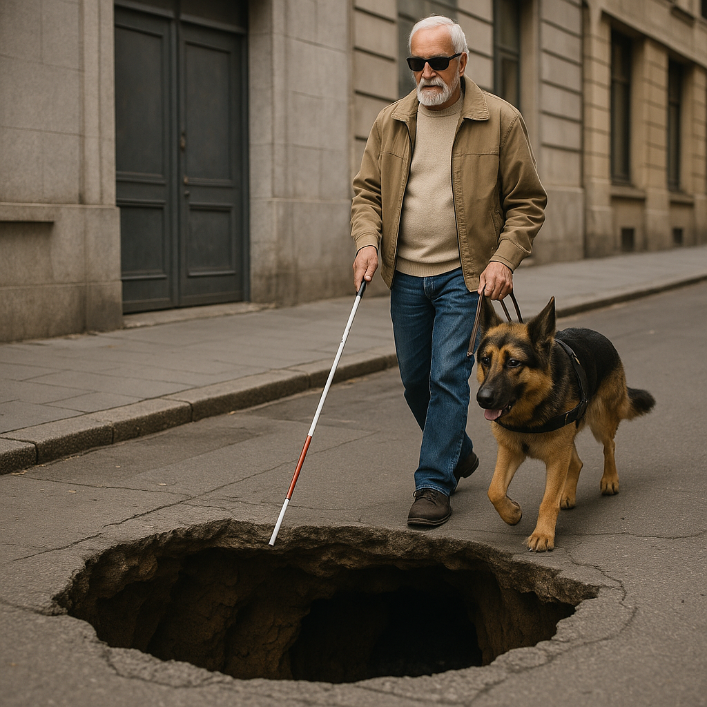 Сегодня всё было как обычно. Шаги — уверенные, хоть и немного осторожные. Трость в правой руке отбивает привычный ритм: тук-тук, лёгкий взмах, снова тук-тук. Рекс идёт слева, чуть впереди, слегка натягивая поводок, но не слишком — ровно настолько, чтобы направлять и предупреждать.