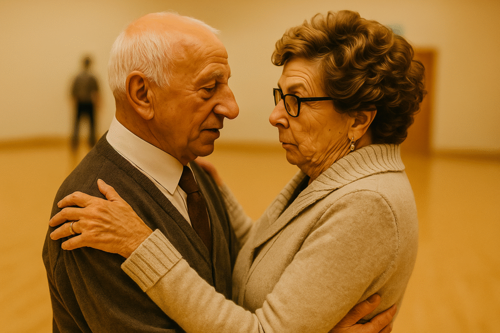 Сергей крепче, чем обычно, обнял Валентину за талию и повёл в медленном ритме. Его ладонь была горячей, и Валентина, как всегда, чуть улыбнулась: «Ну вот, снова наш понедельник». Они ходили сюда сорок лет — сначала мальчишкой с девчонкой, потом молодыми родителями, потом уже «теми самыми, из магазина на углу», а теперь — серебряной парой, которую дежурная по залу узнаёт ещё со ступеней.
